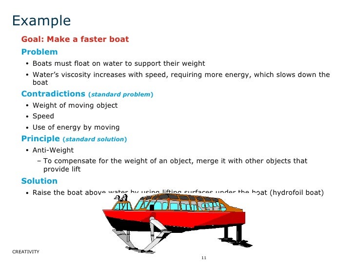 How does TRIZ work in practice? Consider the example of a hydrofoil boat. TRIZ analysis reveals that that the boat uses the principle “To compensate for the weight of an object, merge it with other objects that provide lift.” An engineer studying this principle might use it to invent something new – for example, a pair of marine binoculars that have a plastic foam casing so they will not sink if dropped in water.